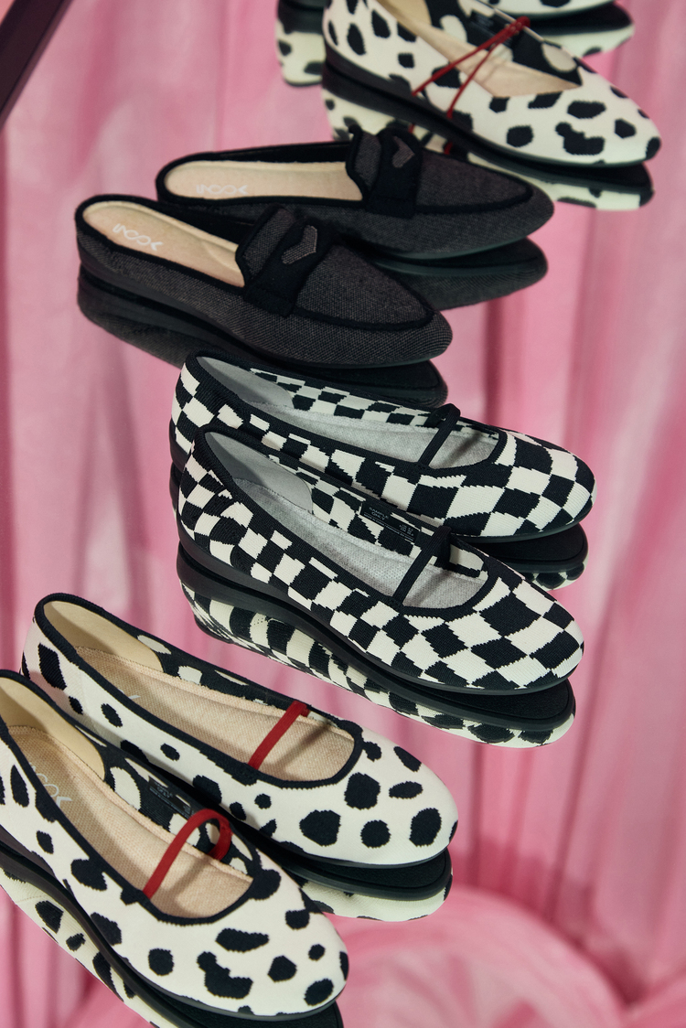 庫伊拉平底鞋以大麥町紋提花設計為主角,黑白相間色調在腳上更顯俏皮,細緻的紅色交叉繫帶增添叛逆精神。