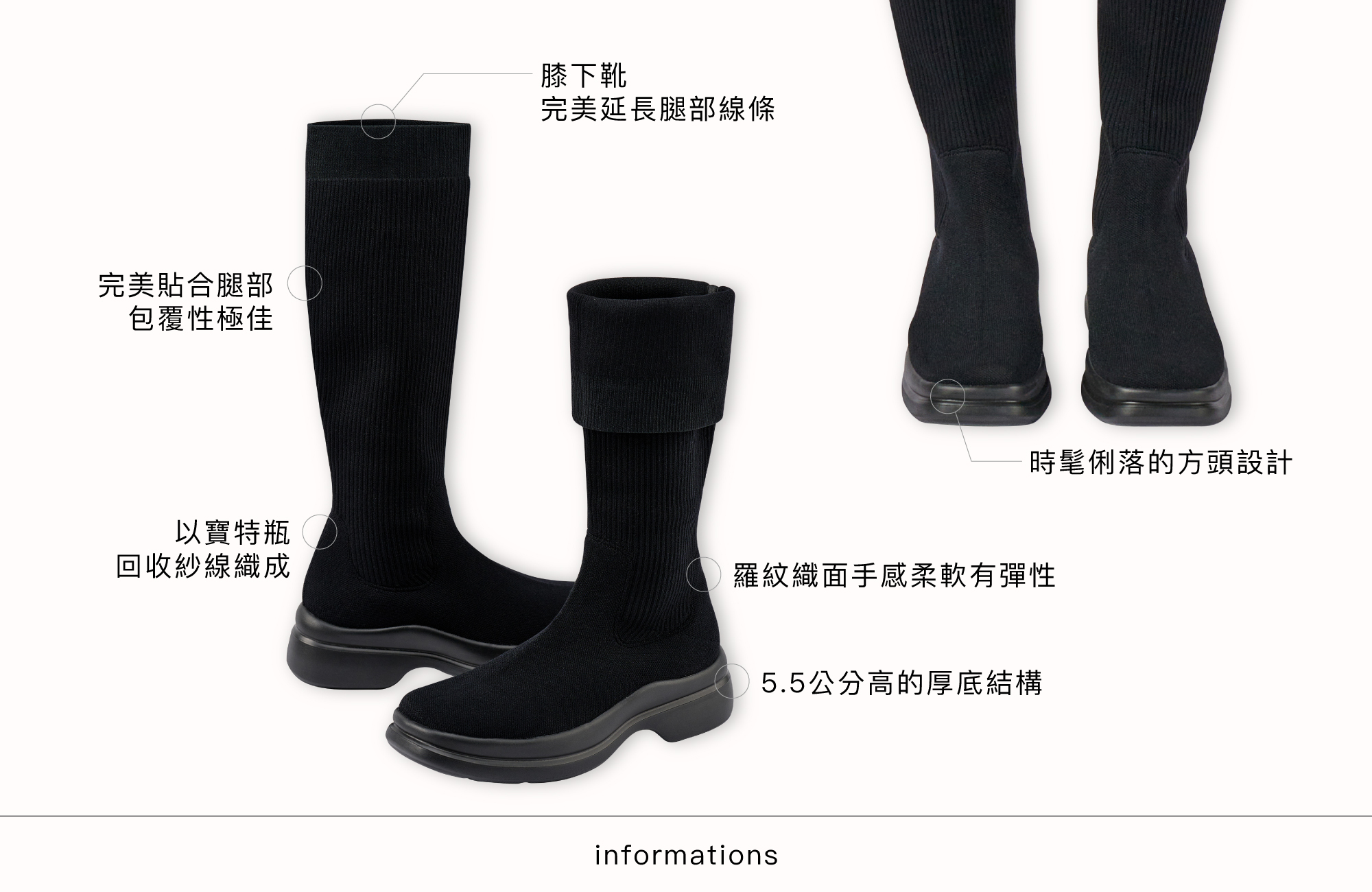 寶特瓶回收線紗織成的膝下羅紋長靴,以前衛的方頭設計和5.5公分的厚底結構,完美延長腿部線條,內含彈性紗完美貼合腿部,一穿上就展現出顯著的修長效果。不論是搭配俏麗的百褶短裙還是緊身褲,都能瞬間提升整體的時髦感與氣場。